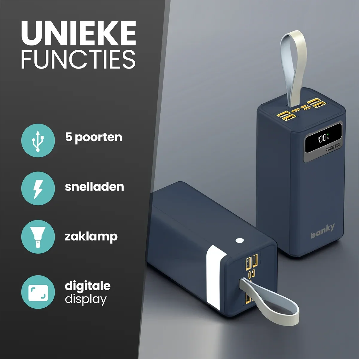 de Banky Powerbank 50.000 mAh is jouw betrouwbare energiebron in elke situatie.